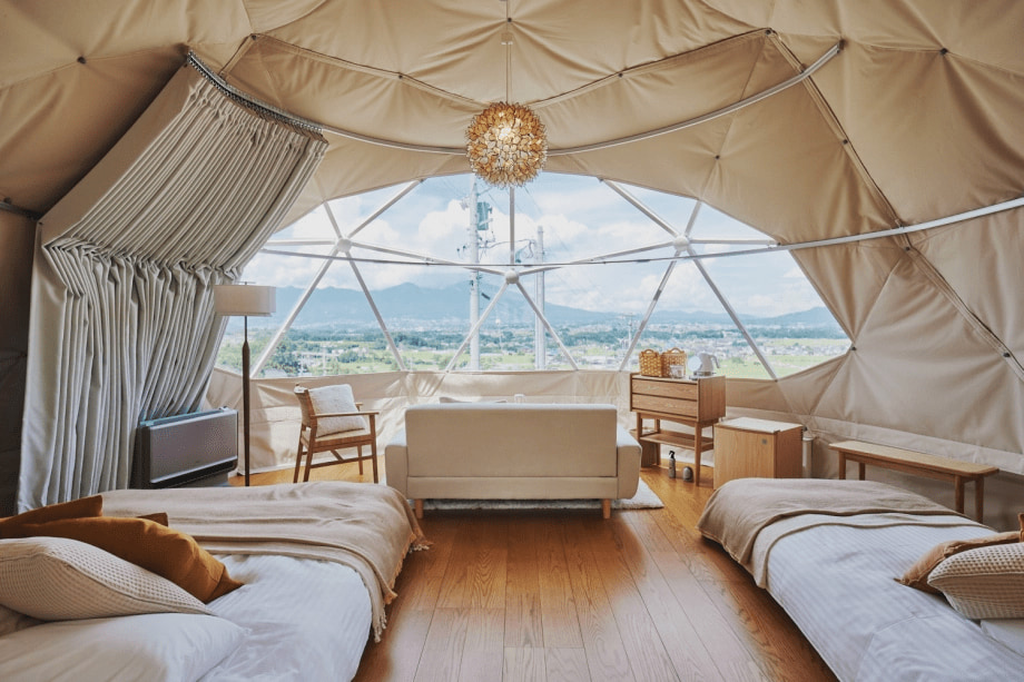 わんちゃん同伴可能な直径7m、34.60m²の定員4名様のドームテントを1棟ご用意しました。直径7mのドームテントの開放的な窓に雄大な浅間山が広がります。愛犬との大切な時間を完全プライベート空間でお過ごしいただけます。テントの周りはプライベートドッグラン。わんちゃん用の食器、トイレ、足洗い場など充実の設備をご用意しております。敷地内には共有の大きなドッグランもあり、滞在中は自由にお使いいただけます。ベッドタイプはシングル4台です。