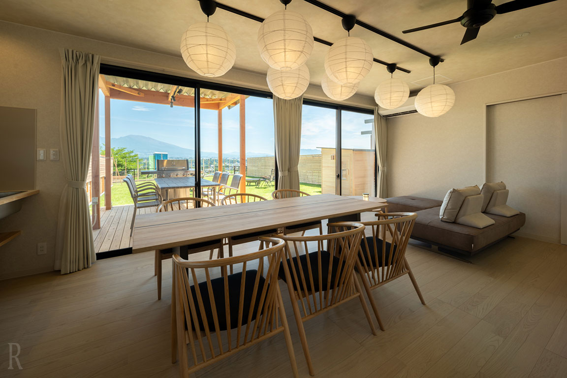 プライベートBBQデッキと庭では、雄大に広がる浅間山を眺めながらBBQをお楽しみいただけます。